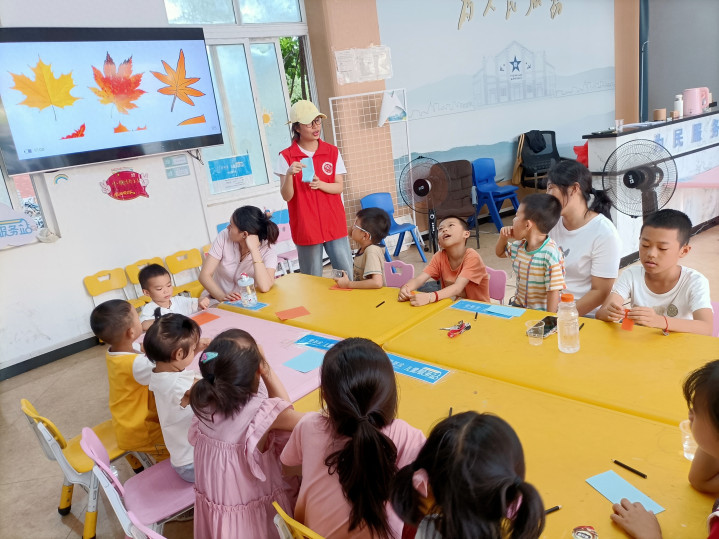 剪枫树叶环节,低龄儿童使用镂空模板快,如五角枫叶在彩纸上拓印轮廓;高龄儿童自由绘制,志愿者指导保持对称性,用铅笔轻勾主叶脉和波浪边缘。